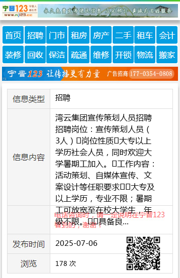 湾云集团宣传策划人员招聘招聘岗位:宣传策划人员(3人)岗位性质大专以上学历社会人员,同时欢迎大学暑期工加入。工作内容:活动策划、自媒体宣传、文案设计等任职要求大专及以上学历,专业不限;暑期工可放宽至在校大学生,年级不限。具备良好的创意策划能力和文字表达能力,思维活跃。工作认真负责,有团队合作精神,暑期工需保证充足的工作时间。会使用基本的办公软件,如Word、Excel、PPT等;能使用PS、AI等设计软件或视频剪辑软件者优先。薪资待遇:丰厚福利,助力成长社会人员提供系统的培训和晋升机会,公司内部有完善的人才培养体系,助力员工不断提升专业技能和综合素质,优秀者可晋升为管理岗位。暑期工提供的实习补贴,根据工作表现还有额外奖励。实习结束后,可获得公司出具的实习证明。工作地点:七台河市科技企业孵化器一楼(一转盘工行旁边)联系电话:17713358990(微信)周女士17713358990 【电话咨询时,请一定说明在七台河信息网看到的,谢谢!】 |