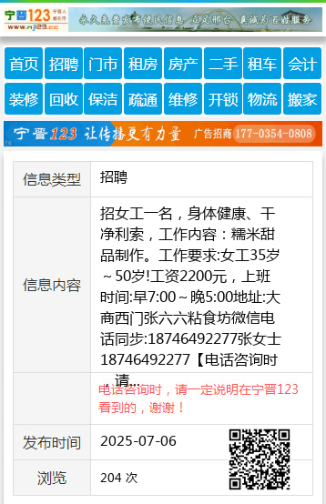 招女工一名,身体健康、干净利索,工作内容:糯米甜品制作。工作要求:女工35岁~50岁!工资2200元,上班时间:早7:00~晚5:00地址:大商西门张六六粘食坊微信电话同步:18746492277张女士18746492277 【电话咨询时,请一定说明在七台河信息网看到的,谢谢!】 |