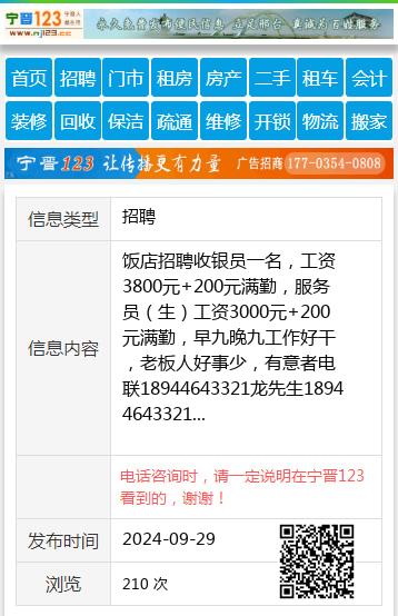 饭店招聘收银员一名,工资3800元+200元满勤,服务员(生)工资3000元+200元满勤,早九晚九工作好干,老板人好事少,有意者电联18944643321龙先生18944643321 【电话咨询时,请一定说明在七台河信息网看到的,谢谢!】 |
