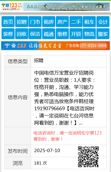 中国电信万宝营业厅招聘岗位:营业员职数:1人要求:性格开朗,沟通、学习能力强,熟悉电脑操作,能力优秀者可适当放宽条件韩经理19190796669 【电话咨询时,请一定说明在七台河信息网看到的,谢谢!】 |