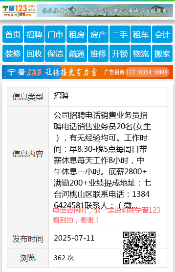 公司招聘电话销售业务员招聘电话销售业务员20名(女生),有无经验均可。工作时间:早8.30-晚5点每周日带薪休息每天工作8小时,中午休息一小时。底薪2800+满勤200+业绩提成地址:七台河桃山区联系电话:13846424581联系人:(微信同号)赵女士13846424581 【电话咨询时,请一定说明在七台河信息网看到的,谢谢!】 |