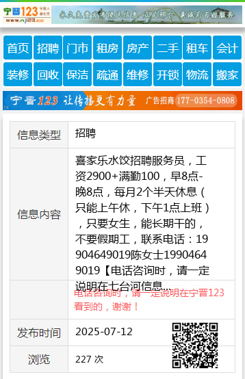 喜家乐水饺招聘服务员,工资2900+满勤100,早8点-晚8点,每月2个半天休息(只能上午休,下午1点上班),只要女生,能长期干的,不要假期工,联系电话:19904649019陈女士19904649019 【电话咨询时,请一定说明在七台河信息网看到的,谢谢!】 |