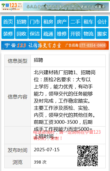 北兴建材砖厂招聘1、招聘岗位:质检2名要求:大专以上学历,能力优秀,有动手能力,领导交代的任务能够及时完成,工作稳定踏实。主要工作涉及质检、实验、内页,领导交代的其他任务。前期工资3000-3500,后期成手工作视能力而定5000+上班时间早六晚六2、一名成型普工,上夜班,上一宿休两天一宿,工资3200元/月+超产,转正交保险,上班时间是晚4点到明天早上8点。有通勤车,转正交保险3、招聘岗位:水工产品车间男工数名要求:能够吃苦耐劳,工资4000-5000,主要生产黑砖,能适应噪音年龄56周岁以下有通勤车,食堂4、招聘岗位:打包工2名男性要求:能够吃苦耐劳,适应高温,计件工资,工资达到6000+,上班时间两个组倒,一上午或者一下午。有相关经验者优先。电话:18746053727工作地址:黑龙江省七台河市茄子河区北兴农场大东林场(龙湖矿旁边)孙女士13104648877 【电话咨询时,请一定说明在七台河信息网看到的,谢谢!】 |