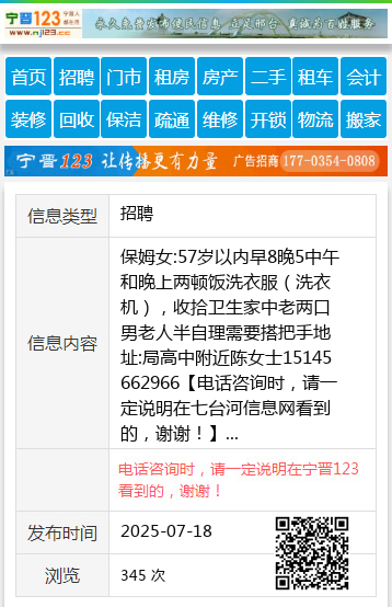 保姆女:57岁以内早8晚5中午和晚上两顿饭洗衣服(洗衣机),收拾卫生家中老两口男老人半自理需要搭把手地址:局高中附近陈女士15145662966 【电话咨询时,请一定说明在七台河信息网看到的,谢谢!】 |