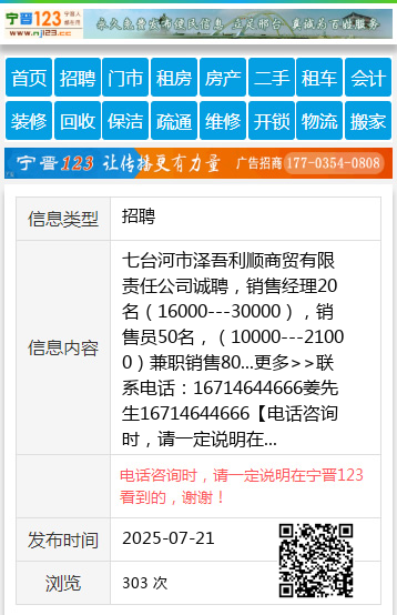 七台河市泽吾利顺商贸有限责任公司诚聘,销售经理20名(16000---30000),销售员50名,(10000---21000)兼职销售80...更多>>联系电话:16714644666姜先生16714644666 【电话咨询时,请一定说明在七台河信息网看到的,谢谢!】 |