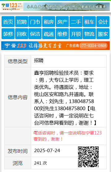 鑫亨招聘检验技术员:要求:男,大专以上学历,理工类优先。待遇面议,地址:桃山区安和路九井道南。联系人:刘先生,13804875800刘先生13804875800 【电话咨询时,请一定说明在七台河信息网看到的,谢谢!】 |