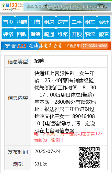 快递线上客服性别:女生年龄:25-40[耶]有销售经验优先[拥抱]工作时间:8:30-17:00每周日休息(带薪)基本薪:2800额外有绩效地址:银达雅居三江鱼馆对过屹鸿文化王女士18904640810 【电话咨询时,请一定说明在七台河信息网看到的,谢谢!】 |