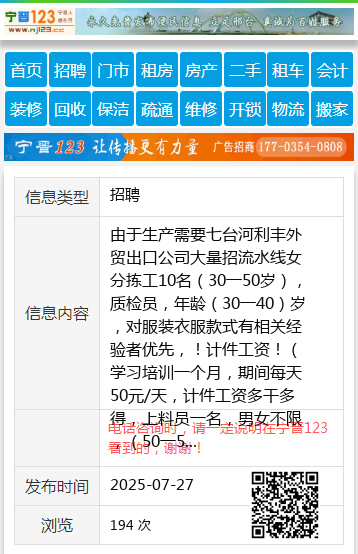 由于生产需要七台河利丰外贸出口公司大量招流水线女分拣工10名(30一50岁),质检员,年龄(30一40)岁,对服装衣服款式有相关经验者优先,!计件工资!(学习培训一个月,期间每天50元/天,计件工资多干多得,上料员一名,男女不限,(50一55)早7:30一16:30中午管饭!以上只招长期工,短工勿扰!厂址:新兴区宝泰隆路26号,1路公交车(走葫芦头沟)家居广场站点前走100米恒阳科技公司红大门院内。☎️13946506087王总13946506087 【电话咨询时,请一定说明在七台河信息网看到的,谢谢!】 |