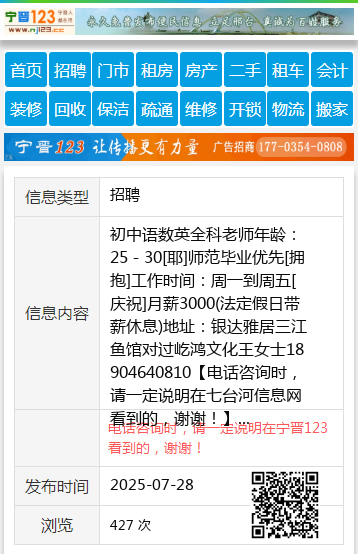 初中语数英全科老师年龄:25-30[耶]师范毕业优先[拥抱]工作时间:周一到周五[庆祝]月薪3000(法定假日带薪休息)地址:银达雅居三江鱼馆对过屹鸿文化王女士18904640810 【电话咨询时,请一定说明在七台河信息网看到的,谢谢!】 |