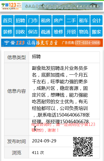副食批发招聘走片业务员多名,底薪加提成,一个月五千左右,旺季能力强的更多,成熟片区,稳定客源,固定片区,想赚钱,能力强能吃苦耐劳的女士优先,有无经验都可以,公司负责培训,,联系电话15046406678张经理。张经理15046406678 【电话咨询时,请一定说明在七台河信息网看到的,谢谢!】 |