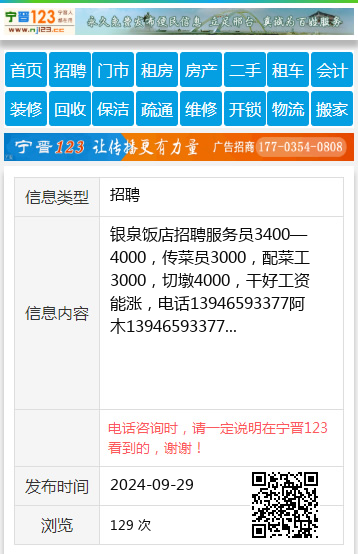 银泉饭店招聘服务员3400—4000,传菜员3000,配菜工3000,切墩4000,干好工资能涨,电话13946593377阿木13946593377 【电话咨询时,请一定说明在七台河信息网看到的,谢谢!】 |