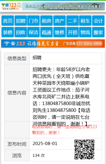 招聘更夫:年龄58岁以内老两口优先(全天班)供吃夏天种菜园冬天烧取暖小锅炉工资面议工作地点:茄子河水库北岗矿二井边上联系电话:13804875800非诚勿扰刘先生13804875800 【电话咨询时,请一定说明在七台河信息网看到的,谢谢!】 |