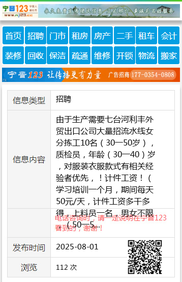由于生产需要七台河利丰外贸出口公司大量招流水线女分拣工10名(30一50岁),质检员,年龄(30一40)岁,对服装衣服款式有相关经验者优先,!计件工资!(学习培训一个月,期间每天50元/天,计件工资多干多得,上料员一名,男女不限,(50一55)早7:30一16:30中午管饭!以上只招长期工,短工勿扰!厂址:新兴区宝泰隆路26号,1路公交车(走葫芦头沟)家居广场站点前走100米恒阳科技公司红大门院内。☎️13946506087王总13946506087 【电话咨询时,请一定说明在七台河信息网看到的,谢谢!】 |
