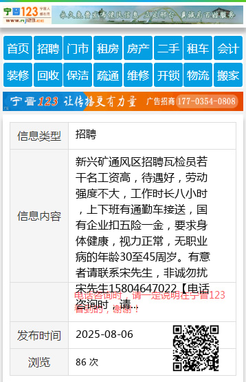 新兴矿通风区招聘瓦检员若干名工资高,待遇好,劳动强度不大,工作时长八小时,上下班有通勤车接送,国有企业扣五险一金,要求身体健康,视力正常,无职业病的年龄30至45周岁。有意者请联系宋先生,非诚勿扰宋先生15804647022 【电话咨询时,请一定说明在七台河信息网看到的,谢谢!】 |