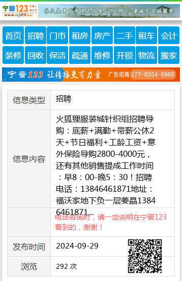 火狐狸服装城针织组招聘导购:底薪+满勤+带薪公休2天+节日福利+工龄工资+意外保险导购2800-4000元,还有其他销售提成工作时间:早8:00-晚5:30!招聘电话:13846461871地址:福沃家地下负一层姜晶13846461871 【电话咨询时,请一定说明在七台河信息网看到的,谢谢!】 |