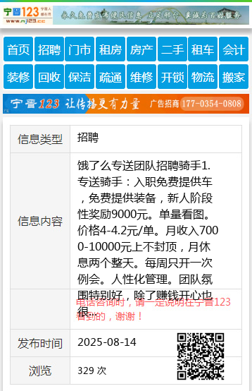 饿了么专送团队招聘骑手1.专送骑手:入职免费提供车,免费提供装备,新人阶段性奖励9000元。单量看图。价格4-4.2元/单。月收入7000-10000元上不封顶,月休息两个整天。每周只开一次例会。人性化管理。团队氛围特别好,除了赚钱开心也很重要。2.兼职骑手:时间自由安排。月收入不想赚3000-5000的你就别来了[呲牙]详情咨询:15946432252微信:s15946432252孙15946432252 【电话咨询时,请一定说明在七台河信息网看到的,谢谢!】 |