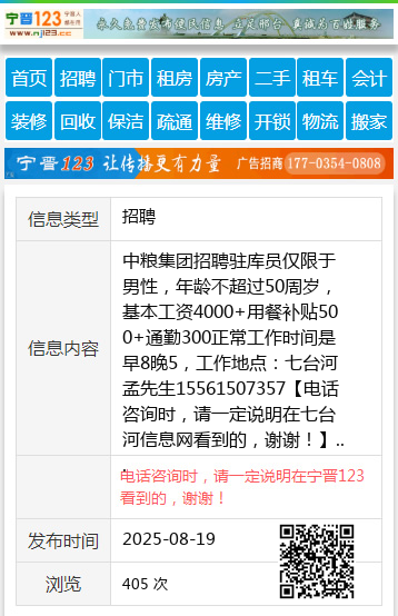 中粮集团招聘驻库员仅限于男性,年龄不超过50周岁,基本工资4000+用餐补贴500+通勤300正常工作时间是早8晚5,工作地点:七台河孟先生15561507357 【电话咨询时,请一定说明在七台河信息网看到的,谢谢!】 |
