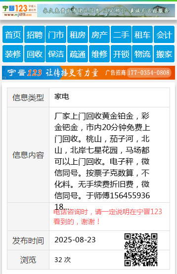 厂家上门回收黄金铂金,彩金钯金,市内20分钟免费上门回收。桃山,茄子河,北山,北岸七星花园,马场都可以上门回收。电子秤,微信同号。按票子克数算,不化料。无手续费折旧费,微信同号。于师傅15645593618 【电话咨询时,请一定说明在七台河信息网看到的,谢谢!】 |