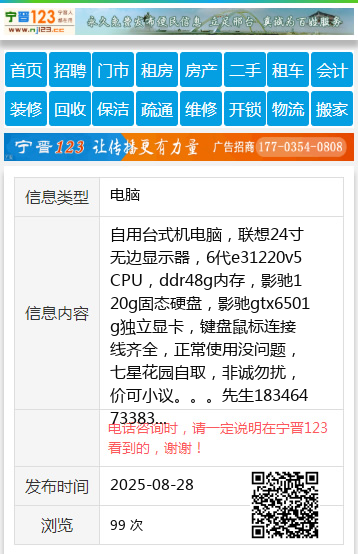 自用台式机电脑,联想24寸无边显示器,6代e31220v5CPU,ddr48g内存,影驰120g固态硬盘,影驰gtx6501g独立显卡,键盘鼠标连接线齐全,正常使用没问题,七星花园自取,非诚勿扰,价可小议。。。先生18346473383 【电话咨询时,请一定说明在七台河信息网看到的,谢谢!】 |