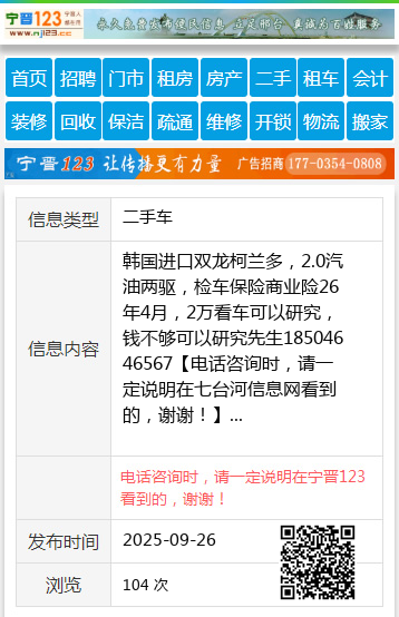 韩国进口双龙柯兰多,2.0汽油两驱,检车保险商业险26年4月,2万看车可以研究,钱不够可以研究先生18504646567 【电话咨询时,请一定说明在七台河信息网看到的,谢谢!】 |