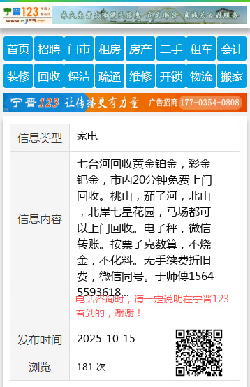 七台河回收黄金铂金,彩金钯金,市内20分钟免费上门回收。桃山,茄子河,北山,北岸七星花园,马场都可以上门回收。电子秤,微信转账。按票子克数算,不烧金,不化料。无手续费折旧费,微信同号。于师傅15645593618 【电话咨询时,请一定说明在七台河信息网看到的,谢谢!】 |