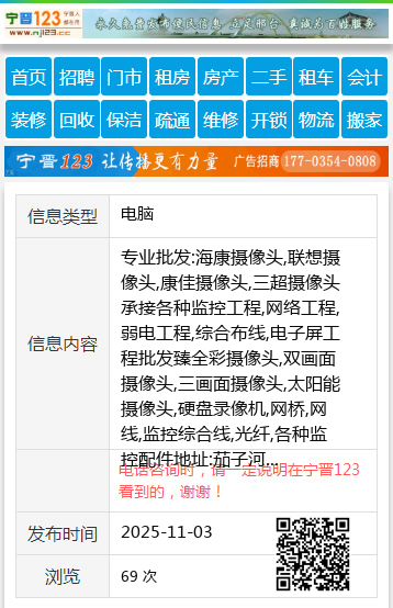 专业批发:海康摄像头,联想摄像头,康佳摄像头,三超摄像头承接各种监控工程,网络工程,弱电工程,综合布线,电子屏工程批发臻全彩摄像头,双画面摄像头,三画面摄像头,太阳能摄像头,硬盘录像机,网桥,网线,监控综合线,光纤,各种监控配件地址:茄子河区富贵园5号楼谦诚监控联系电话:1394653902613039799026孙14704644989 【电话咨询时,请一定说明在七台河信息网看到的,谢谢!】 |