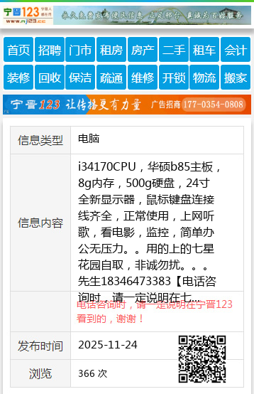 i34170CPU,华硕b85主板,8g内存,500g硬盘,24寸全新显示器,鼠标键盘连接线齐全,正常使用,上网听歌,看电影,监控,简单办公无压力。。用的上的七星花园自取,非诚勿扰。。。先生18346473383 【电话咨询时,请一定说明在七台河信息网看到的,谢谢!】 |