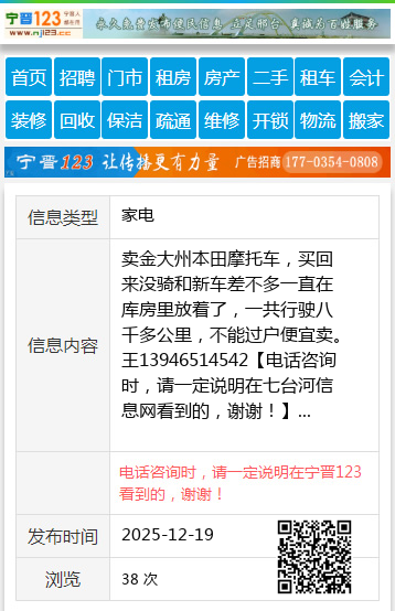 卖金大州本田摩托车,买回来没骑和新车差不多一直在库房里放着了,一共行驶八千多公里,不能过户便宜卖。王13946514542 【电话咨询时,请一定说明在七台河信息网看到的,谢谢!】 |
