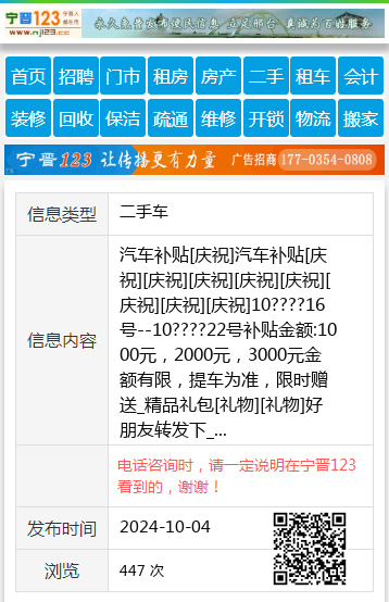 汽车补贴[庆祝]汽车补贴[庆祝][庆祝][庆祝][庆祝][庆祝][庆祝][庆祝][庆祝]10????16号--10????22号补贴金额:1000元,2000元,3000元金额有限,提车为准,限时赠送_精品礼包[礼物][礼物]好朋友转发下_谢谢咨询销售电话:151-4564-81880464-8859876董经理15145648188 |