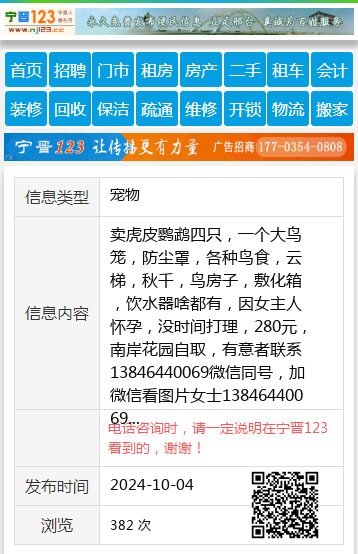 卖虎皮鹦鹉四只,一个大鸟笼,防尘罩,各种鸟食,云梯,秋千,鸟房子,敷化箱,饮水器啥都有,因女主人怀孕,没时间打理,280元,南岸花园自取,有意者联系13846440069微信同号,加微信看图片女士13846440069 【电话咨询时,请一定说明在七台河信息网看到的,谢谢!】 |
