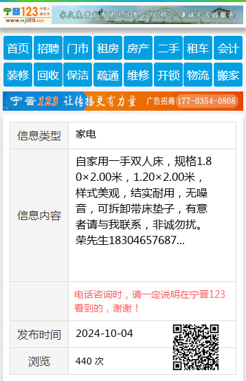 自家用一手双人床,规格1.80×2.00米,1.20×2.00米,样式美观,结实耐用,无噪音,可拆卸带床垫子,有意者请与我联系,非诚勿扰。荣先生18304657687