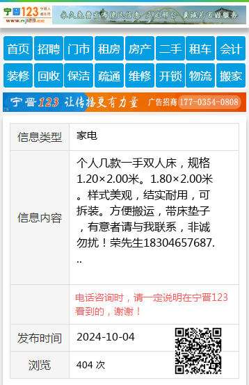 个人几款一手双人床,规格1.20×2.00米。1.80×2.00米。样式美观,结实耐用,可拆装。方便搬运,带床垫子,有意者请与我联系,非诚勿扰!荣先生18304657687