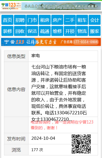 七台河山下粮油市场有一粮油店转让,有固定的送货客源,并承诺转让后协助和客户交接,这就意味着接手后就可以开始营业,并有稳定的收入,由于去外地发展,现低价转让,具体事宜电话联系。电话13304672210石女士13304672210 【电话咨询时,请一定说明在七台河信息网看到的,谢谢!】 |