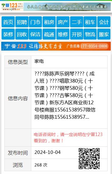 ????陈陈声乐钢琴????(成人班)????唱歌380元(十节课)????钢琴580元(十节课)????古筝580元(十节课)新东方A区商业街12号楼商服15561538957微信同号陈陈15561538957 【电话咨询时,请一定说明在七台河信息网看到的,谢谢!】 |
