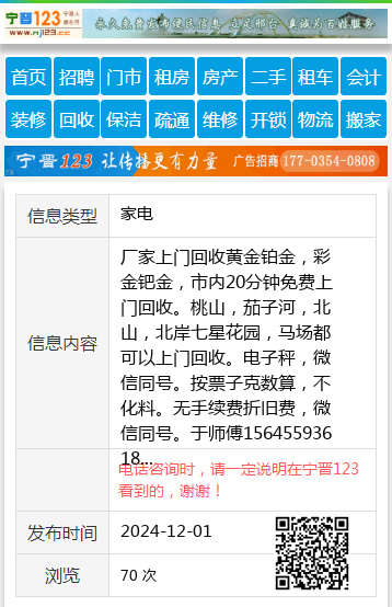 厂家上门回收黄金铂金,彩金钯金,市内20分钟免费上门回收。桃山,茄子河,北山,北岸七星花园,马场都可以上门回收。电子秤,微信同号。按票子克数算,不化料。无手续费折旧费,微信同号。于师傅15645593618 【电话咨询时,请一定说明在七台河信息网看到的,谢谢!】 |