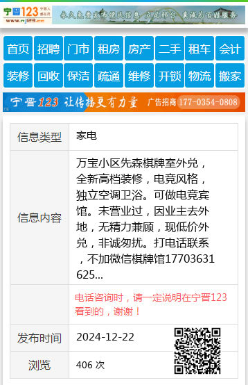 万宝小区先森棋牌室外兑,全新高档装修,电竞风格,独立空调卫浴。可做电竞宾馆。未营业过,因业主去外地,无精力兼顾,现低价外兑,非诚匆扰。打电话联系,不加微信棋牌馆17703631625 【电话咨询时,请一定说明在七台河信息网看到的,谢谢!】 |