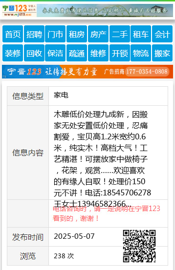 木雕低价处理九成新,因搬家无处安置低价处理,忍痛割爱,宝贝高1.2米宽约0.6米,纯实木!高档大气!工艺精湛!可摆放家中做椅子,花架,观赏……欢迎喜欢的有缘人自取!处理价150元不讲!电话:18545706278王女士13946582366 【电话咨询时,请一定说明在七台河信息网看到的,谢谢!】 |