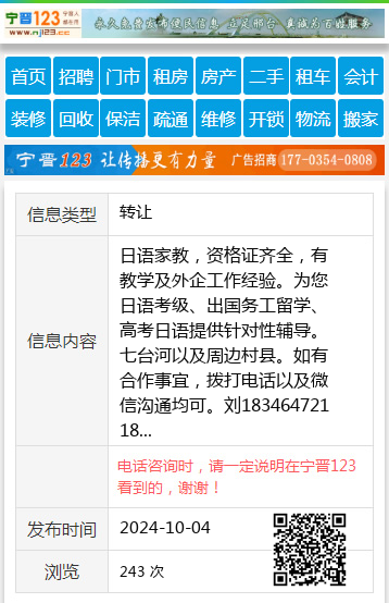 日语家教,资格证齐全,有教学及外企工作经验。为您日语考级、出国务工留学、高考日语提供针对性辅导。七台河以及周边村县。如有合作事宜,拨打电话以及微信沟通均可。刘18346472118 【电话咨询时,请一定说明在七台河信息网看到的,谢谢!】 |