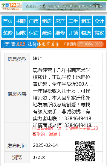 现有经营十几年书画艺术学校转让,正规学校!地理位置优越,全年学员近300人,一年轻松收入几十万,可代培师资,本人因举家迁移外地发展所以忍痛割爱!寻找有缘人接手,非诚勿扰!有实力者电联:13384649418详情面谈老师13384649418 【电话咨询时,请一定说明在七台河信息网看到的,谢谢!】 |