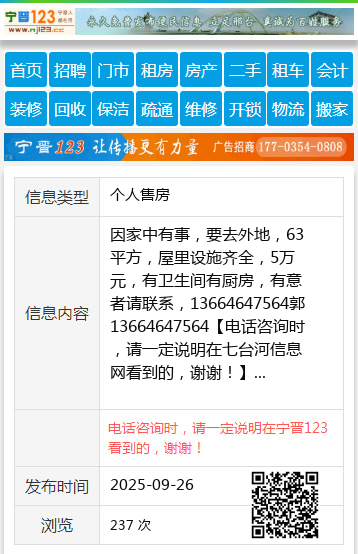 因家中有事,要去外地,63平方,屋里设施齐全,5万元,有卫生间有厨房,有意者请联系,13664647564郭13664647564 【电话咨询时,请一定说明在七台河信息网看到的,谢谢!】 |