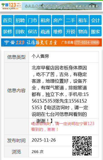 北岸早餐店因老板身体原因,吃不了苦,吉兑,有稳定客源,地理位置好,设备齐全,有煤气管道,排烟管道都有,独立下水,手机号:15561525353张先生15561525353 【电话咨询时,请一定说明在七台河信息网看到的,谢谢!】 |