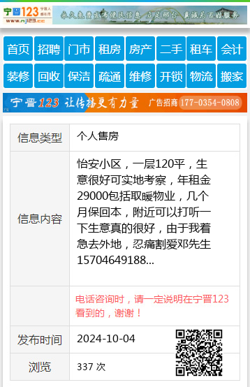怡安小区,一层120平,生意很好可实地考察,年租金29000包括取暖物业,几个月保回本,附近可以打听一下生意真的很好,由于我着急去外地,忍痛割爱邓先生15704649188 【电话咨询时,请一定说明在七台河信息网看到的,谢谢!】 |