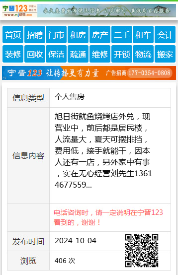 旭日街鱿鱼烧烤店外兑,现营业中,前后都是居民楼,人流量大,夏天可摆排挡,费用低,接手就能干,因本人还有一店,另外家中有事,实在无心经营刘先生13614677559 【电话咨询时,请一定说明在七台河信息网看到的,谢谢!】 |