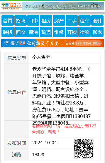 老双华全羊馆414.8平米,可开饺子馆,烧烤、烤全羊、年猪馆,大型中餐,小型宴请,明档、配套设施齐全,无需再添加设备和桌椅,进料就开业!转让费23.8万,房租费16.8万,地址:景丰路65号景丰家园☎️13804872999经理13804872999 【电话咨询时,请一定说明在七台河信息网看到的,谢谢!】 |