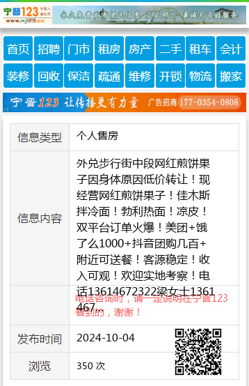 外兑步行街中段网红煎饼果子因身体原因低价转让!现经营网红煎饼果子!佳木斯拌冷面!勃利热面!凉皮!双平台订单火爆!美团+饿了么1000+抖音团购几百+附近可送餐!客源稳定!收入可观!欢迎实地考察!电话13614672322梁女士13614672322 【电话咨询时,请一定说明在七台河信息网看到的,谢谢!】 |