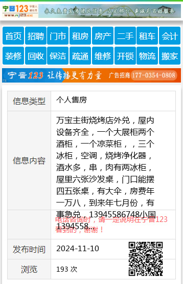 万宝主街烧烤店外兑,屋内设备齐全,一个大展柜两个酒柜,一个凉菜柜,,三个冰柜,空调,烧烤净化器,酒水多,串,肉有两冰柜,屋里六张沙发桌,门口能摆四五张桌,有大伞,房费年一万八,到来年七月份,有事急兑,13945586748小国13945586748 【电话咨询时,请一定说明在七台河信息网看到的,谢谢!】 |