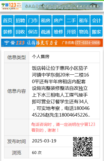 饭店转让位于惠民小区茄子河镇中学东侧20米一二楼160平还有半年房租店内配套设施完整装修整洁自改独立上下水三相电人工煤气接手即可营业订餐学生还有34人,可实地考察,电话18004645226赵先生18004645226 【电话咨询时,请一定说明在七台河信息网看到的,谢谢!】 |