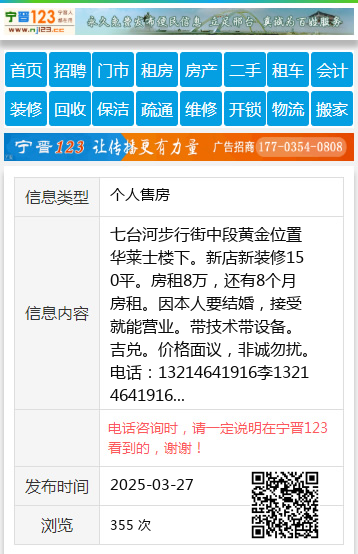 七台河步行街中段黄金位置华莱士楼下。新店新装修150平。房租8万,还有8个月房租。因本人要结婚,接受就能营业。带技术带设备。吉兑。价格面议,非诚勿扰。电话:13214641916李13214641916 【电话咨询时,请一定说明在七台河信息网看到的,谢谢!】 |