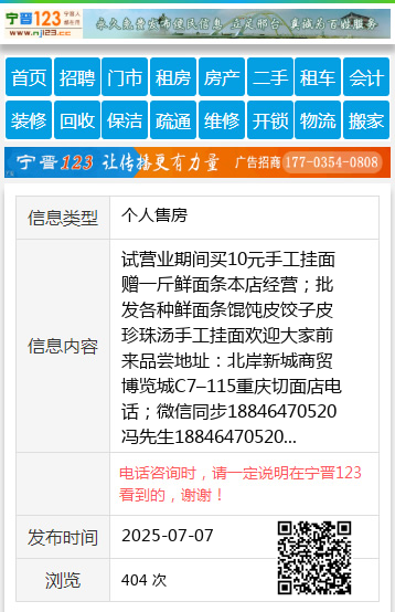 试营业期间买10元手工挂面赠一斤鲜面条本店经营;批发各种鲜面条馄饨皮饺子皮珍珠汤手工挂面欢迎大家前来品尝地址:北岸新城商贸博览城C7–115重庆切面店电话;微信同步18846470520冯先生18846470520 【电话咨询时,请一定说明在七台河信息网看到的,谢谢!】 |