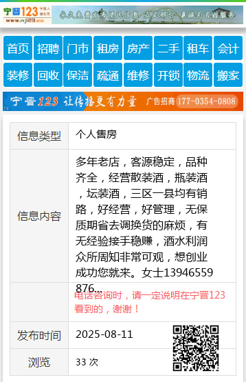 多年老店,客源稳定,品种齐全,经营散装酒,瓶装酒,坛装酒,三区一县均有销路,好经营,好管理,无保质期省去调换货的麻烦,有无经验接手稳赚,酒水利润众所周知非常可观,想创业成功您就来。女士13946559876 【电话咨询时,请一定说明在七台河信息网看到的,谢谢!】 |